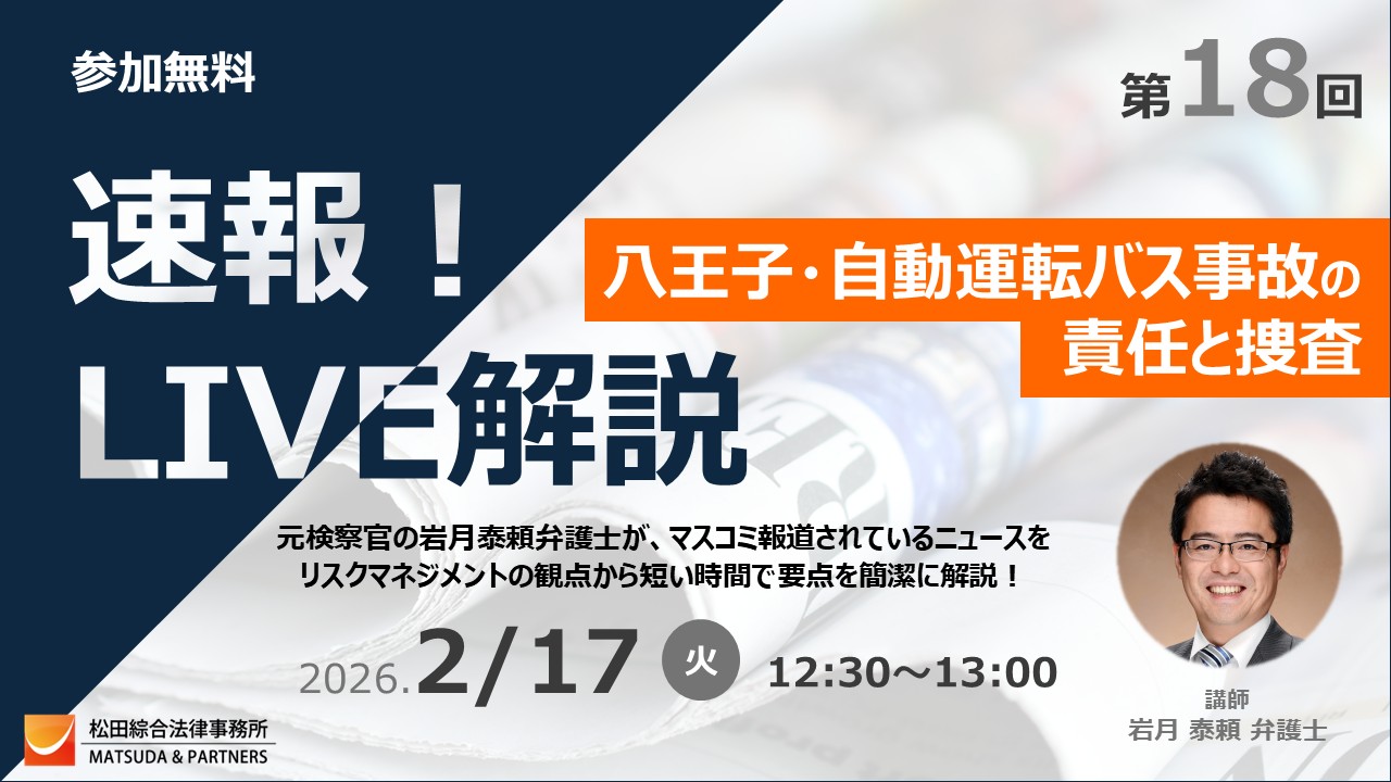 元検事の岩月弁護士が、報道されている企業不祥事や事故をリスクマネジメントの観点から短時間で解説します。是非ご参加ください。