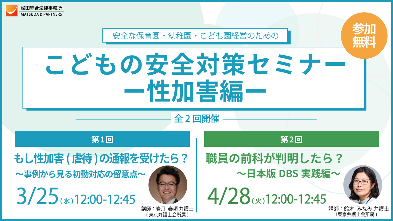 本セミナーは、子どもの安全を最優先に考えながら、経営者・園長として直面しうる判断のポイントを整理することを目的としています。日々の園運営や、万が一の事態に備える一助として、ご活用いただければ幸いです。