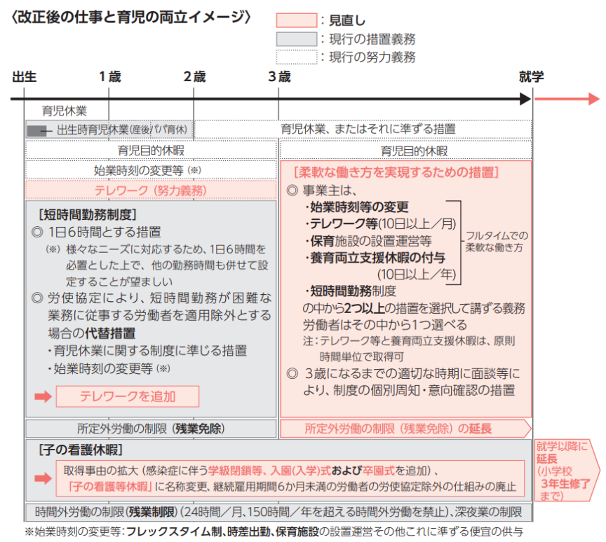 また、今回の改正後の仕事と育児の両立イメージは下記表の通りです(厚生労働省「事業主の皆さまへ 育児・介護休業法 改正ポイントのご案内」より引用。)。