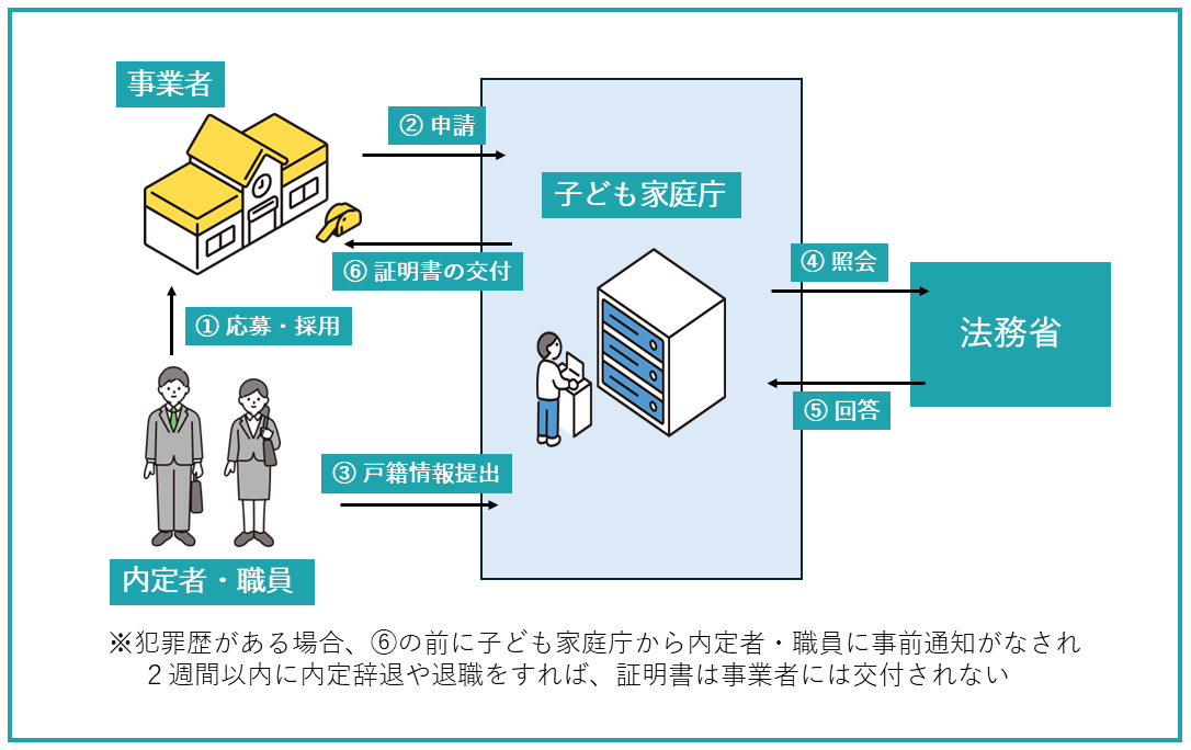 ※犯罪歴がある場合、⑥の前に子ども家庭庁から内定者・職員に事前通知がなされ、2週間以内に内定辞退や退職をすれば、証明書は事業者には交付されない